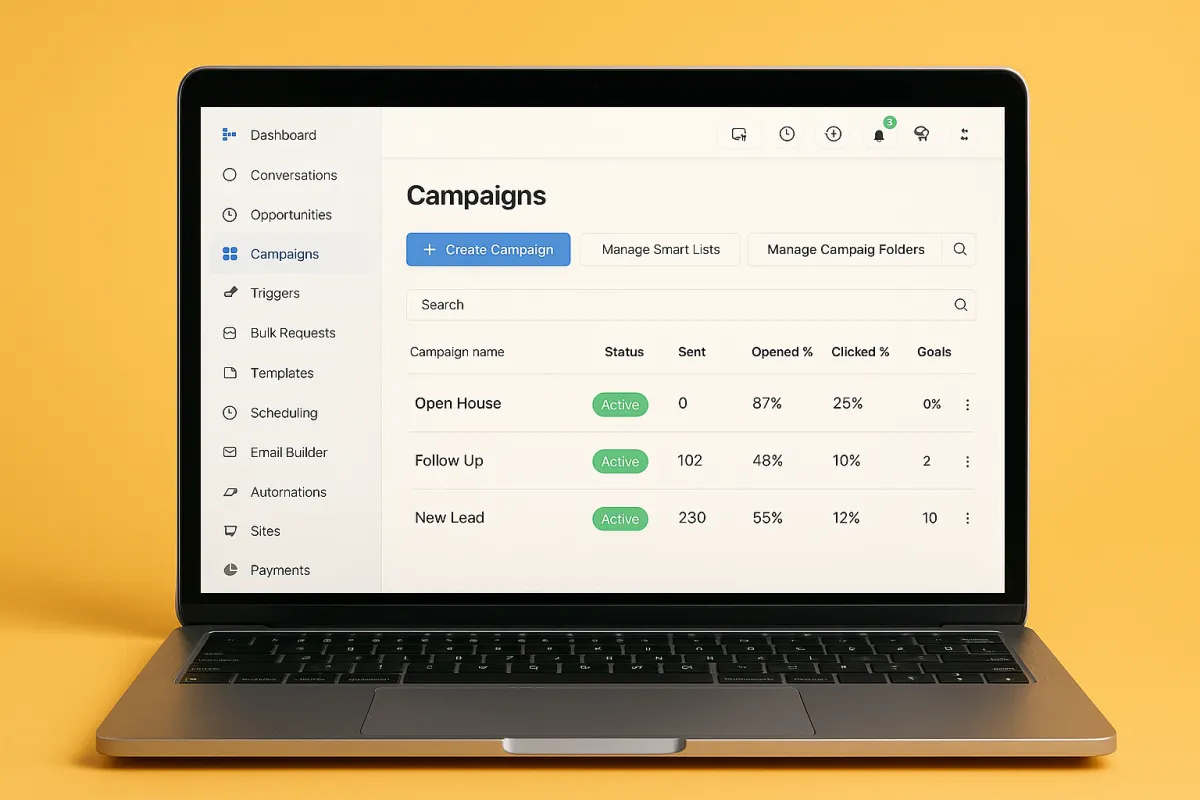 Set up drip campaigns, SMS sequences, and social posts that run on autopilot while you close deals. Build complete buyer and seller funnels that convert.